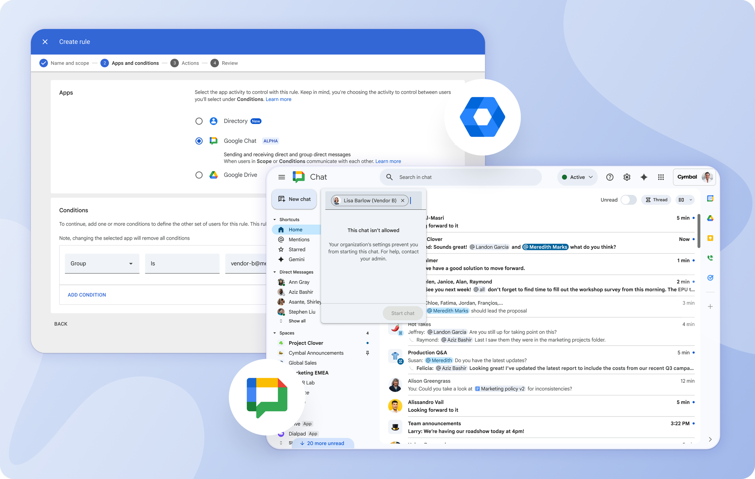 Enabling Google Workspace admins to create information barriers across Chat using granular trust rule policies.